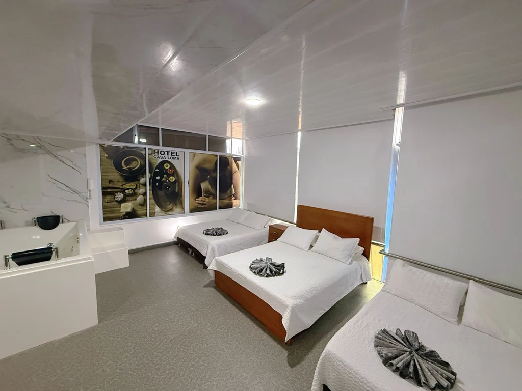 Para aquellos que buscan lo mejor en comodidad y relajación, la Habitación Familiar con Jacuzzi es la elección perfecta. Con tres camas dobles y un amplio jacuzzi, esta habitación está diseñada para ofrecer una experiencia relajante y memorable a familias o grupos grandes.